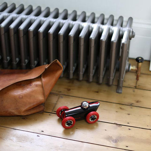 Solidly constructed from heavy duty plastic with moving rubber wheels the Playforever range is designed in the UK for finish and functionality. The Midi Roddie is a timeless black with red stripes. red tyres and chrome accents and it's surfaces are flawless. While it looks great on the shelf it is robust enough for everyday play and unrivalled in quality.