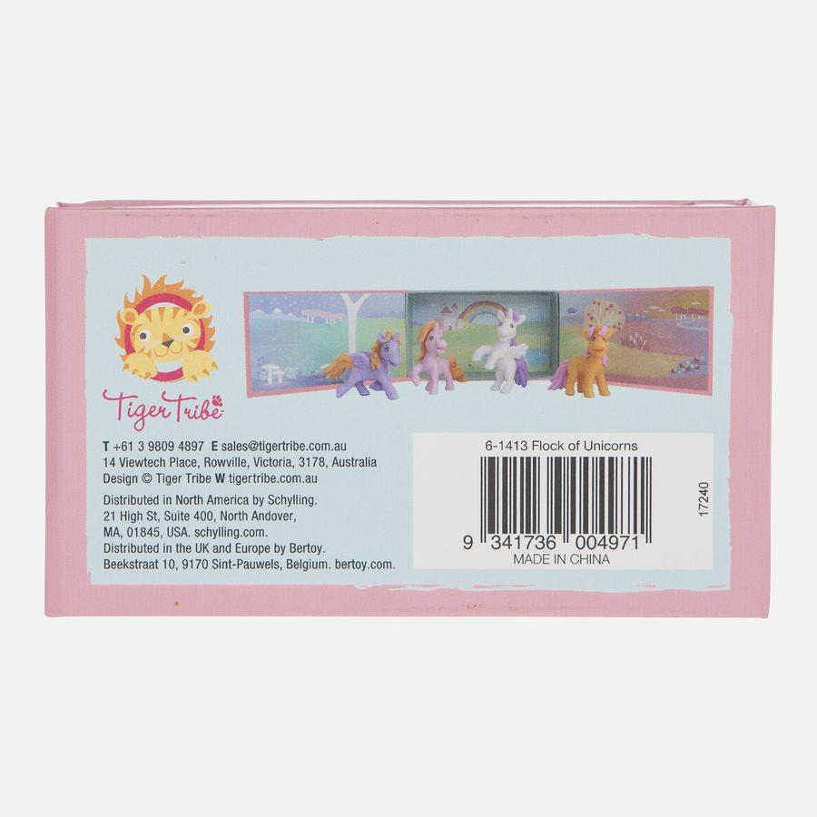 The ultimate in pocket-sized portable play - now you can take your Flock of Unicorns everywhere! Create your own on-the-go adventures with four magical mini unicorns. Each box converts into a beautifully illustrated back drop for play and display.