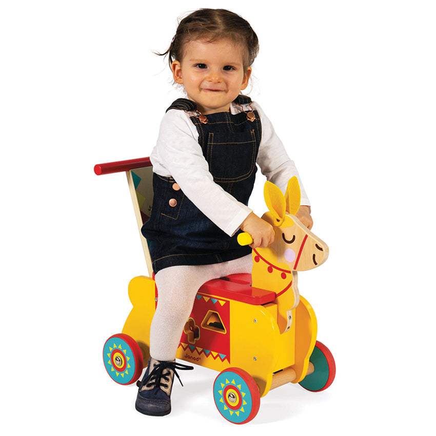 The llama-shaped ride-on toy from Janod is ideal for the development of your child's motor skills and sense of balance. Whether straddled or pushed, it will help children to better manage their stance while enabling them to explore the world around them. Littlies will be able to test their dexterity with the shape sorter included in the llamas body and the shapes are easily retrieved by lifting the seat. Super cute with felt ears and printed with an Inca themed design, the Janod Llama Ride On is made from FSC certified wood and has 4 rubber wheels that won't leave marks on the floor and ensures safety with the anti-tipping mechanism.