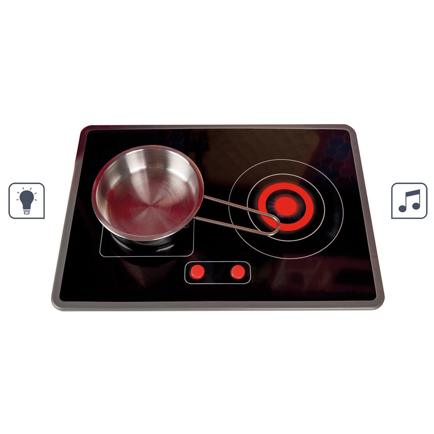 The Janod Reversible Kitchen Laundry is a fantastic way for littlies to explore real life skills and encourage role play at the same time. Made from wood, the kitchen on the front is fully equipped with an oven, microwave, pantry cupboard and stainless-steel sink. The oven has movable knobs that 'click' when you turn them and the cooktop has LED lights and sound effects just like a real kitchen. Simply press the red buttons once to see the cooktop rings light up, then a second time to hear water boiling. Push the buttons a third time to turn them off. But if you forget, don't worry, nothing will boil over, the cooktop will switch off automatically after 30 seconds. The kitchen also comes with metals utensils including a ladle, strainer, egg flip and a pasta server, a saucepan with lid and a colander. It even has an oven mitt so you're ready to cook up a storm!