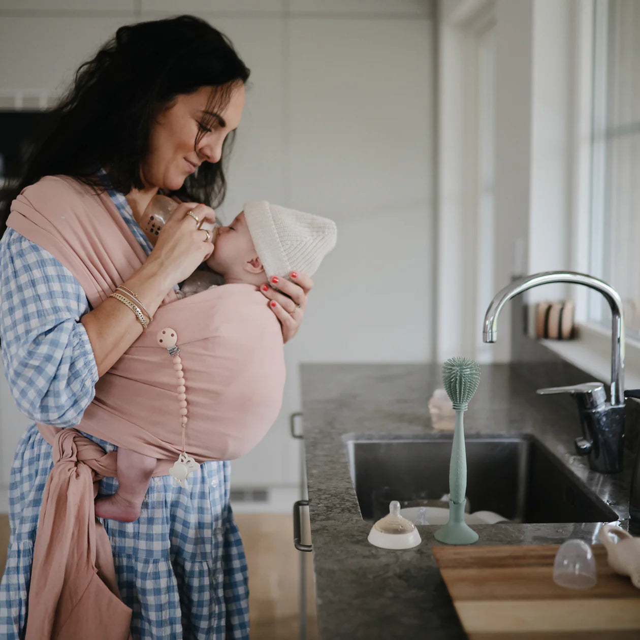 The minimalist stack of silicone beads and sturdy clasp not only look beautiful but also ensure soothing items stay within reach (and off the floor!). Easy to clean and safe for everyday use, it’s the perfect accessory for babies and parents alike.
