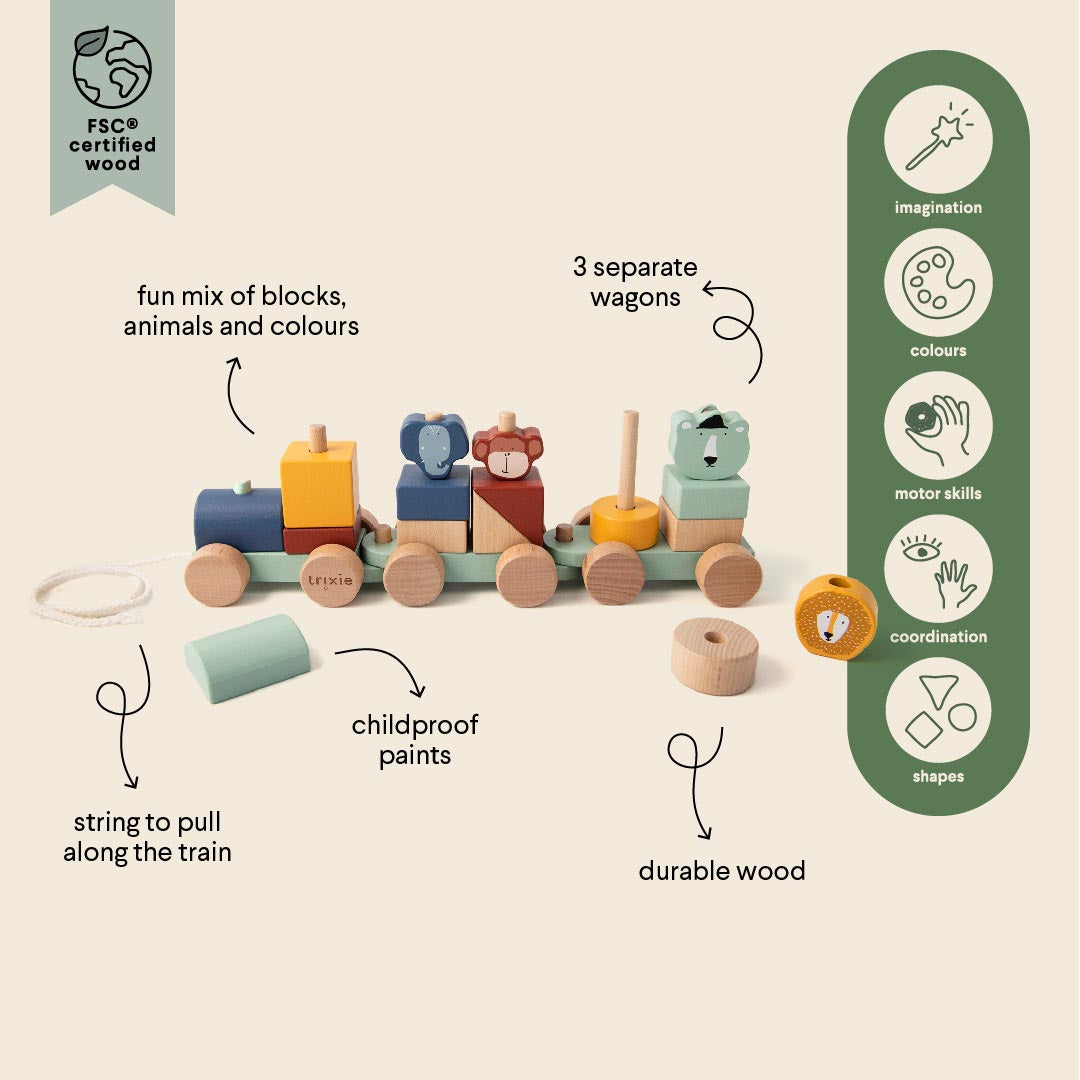Hop on the train with our animal friends! With all the different blocks in various colours, you can create your own wagons. Use the string attached to the front to pull your train along on the greatest adventures! The train and all its elements are made of 100% FSC® certified wood. All paints on this product are water-based, safe for children and non-toxic.